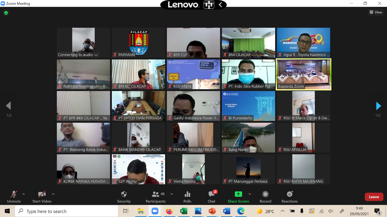 Pemerintah Kabupaten Cilacap melalui Bappeda Kabupaten Cilacap pada tanggal 29 September 2021 menyelenggarakan Rakor Forum Tanggungjawab Sosial dan Lingkungan Perusahaan (FTJSLP) Tahun 2021 dengan tema “Melalui Sinergitas dan Kemitraan kita tingkatkan pemerataan pembangunan untuk mewujudkan Cilacap Semakin Sejahtera”. Acara diselenggarakan di Aula Bappeda Jl. Kauman No.28B Kab. Cilacap, adanya Pandemi Covid 19 mengakibatkan Rapat Koordinasi diselenggarakan secara langsung dan melalui Zoom Meeting. Acara dihadiri langsung oleh Asisten Perekonomian dan Pembangunan Sekda Kab. Cilacap selaku Wakil Ketua II Forum TJSLP Kab. Cilacap (Drs. Wasi Ariyadi, M.M), Staf Ahli Bupati Bidang Ekonomi, Keuangan dan Pembangunan Setda Kab. Cilacap ( Dian Arinda Murni, S.H, M.M), Kepala Bappeda Kab. Cilacap (Ir. Sujito, M.Si), Sekretaris Bappeda (Edy Supriyono, S.os, M.M), Kepala OPD, Kepala Bidang di Bappeda Kab. Cilacap dan 52 peserta terdiri dari BUMN, BUMD dan Perusahaan Swasta di Kab. Cilacap serta Pemimpin Kantor Bank Indonesia Purwokerto melalui Zoom Meeting.
