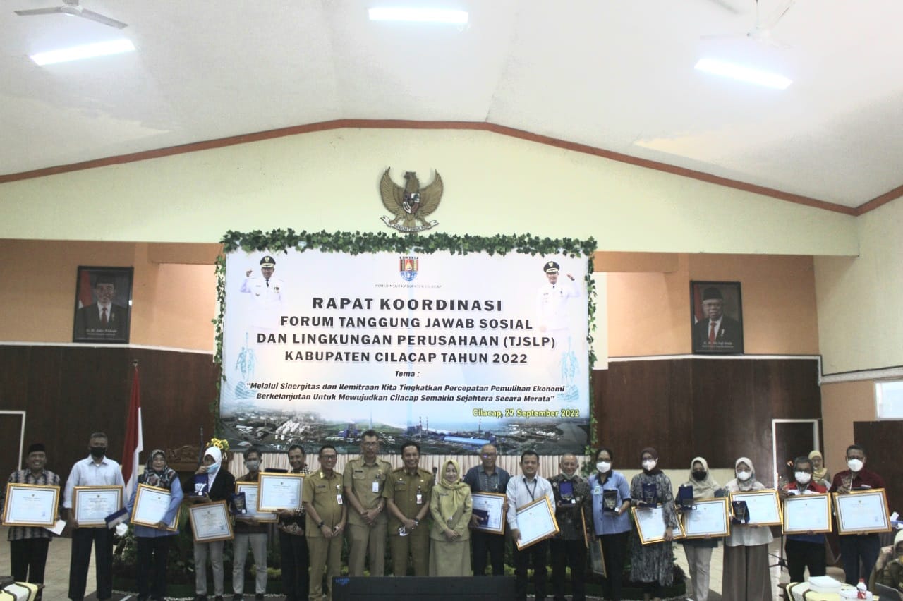 Pada Acara Rakor Forum TJSLP tersebut juga diserahkan Piagam Penghargaan TJSLP Award Tahun 2022 yang merupakan hasil Penilaian Pelaksanaan TJSLP/CSR Tahun 2021. Penilaian tidak berdasarkan pada besarnya nilai nominal TJSLP yang dilaksanakan, akan tetapi lebih dititik beratkan pada seberapa besar kegiatan TJSLP dalam mendukung Program Prioritas Pembangunan Kabupaten Cilacap untuk membantu menyelesaikan permasalahan yang ada di Kabupaten Cilacap. Piagam Penghargaan diberikan dalam beberapa kategori diantaranya Kategori BUMN : Terbaik 1 yaitu PT. Indonesia Power PLTU Jateng 2 Adipala OMU, Terbaik 2 : PT. KPI RU IV Cilacap & terbaik 3 : PT. Solusi Bangun Indonesia (SBI). Kategori BUMD Terbaik 1 : Perumda Kawasan Industri Cilacap, Terbaik 2 : Perumdam Tirta Wijaya Cilacap & Terbaik 3 : PT. BPR BKK Cilacap ( Perseroda). Kategori Perusahaan Swasta Terbaik 1 : PT. Indo Java Rubber Planting Co, Terbaik 2 : PT. Sumber Alfaria Trijaya Tbk Cilacap & Terbaik 3 : PT. Waroeng Batok Industry. Kategori Perbankan Terbaik 1 : PT. BNI Cabang Cilacap, Terbaik 2 : PT. BRI Cabang Cilacap, Terbaik 3 : PT. Bank Jateng Cabang Cilacap. Kategori Jasa Kesehatan Terbaik 1 : RSI Fatimah Cilacap, Terbaik 2 : Rumah Sakit Santa Maria & Terbaik 3 : RSU Aprilia Cilacap. Kategori Tersinergi dengan 4 Pilar Bangga Mbangun Desa yaitu : Pilar Pendidikan : Perumda Kawasan Industri Cilacap, Pilar Kesehatan : PT. Indonesia Power PLTU Jateng 2 Adipala OMU, Pilar Ekonomi : PT. KPI RU IV Cilacap dan Pilar Lingkungan Sosial Budaya : PT. Sumber Segara Primadaya (S2P) serta Mitra Strategis Pelaksanaan TJSLP Kab. Cilacap : Kantor Perwakilan Bank Indonesia Purwokerto.