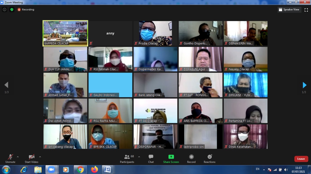 Pemerintah Kab. Cilacap melalui Bappeda Kab. Cilacap pada tanggal 07 Juli 2021 menyelenggarakan Rapat Forum Tanggungjawab Sosial dan Lingkungan Perusahaan (TJSLP) Kab. Cilacap Semester I Tahun 2021. Karena di Kab. Cilacap kondisi Pandemi Covid 19 yang tinggi dan masuk zona merah, rapat diselenggarakan secara langsung dan melalui Zoom Meeting. Peserta yang hadir secara langsung di Ruang Rapat Gedung Akbid Graha Mandiri Kab. Cilacap Kantor Sementara Bappeda yaitu, Sekretaris Daerah Kab. Cilacap selaku Ketua Forum TJSLP Kab. Cilacap (Drs. Farid Ma’ruf, ST., M.M), Asisten Pemerintahan dan Kesejahteraan Rakyat Sekda Kab. Cilacap selaku Wakil Ketua I Forum TJSLP Kab. Cilacap (Drs. Dian Setyabudi, M.M), Asisten Perekonomian dan Pembangunan Sekda Kab. Cilacap selaku Wakil Ketua II Forum TJSLP Kab. Cilacap (Drs. Wasi Ariyadi, M.M), Kepala Bappeda Kab. Cilacap selaku Sekretaris Umum TJSLP Kab. Cilacap (Sumbowo, S.os, M.Si), Sekretaris Bappeda (Edy Supriyono, S.os, M.M), dan para Kepala Bidang di Bappeda Kab. Cilacap sedangkan yang mengikuti secara zoom meeting sebanyak 68 peserta terdiri dari OPD, BUMN, BUMD dan Perusahaan Swasta di Kab. Cilacap.