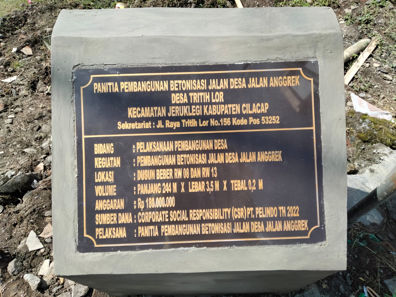 | Objek Realisasi | : | Bantuan Betonisasi Jalan Desa, Jalan Anggrek Desa Tritih Lor |