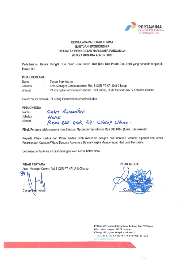 Bantuan dana sponsorship diberikan oleh PT Kilang Pertamina Internasional Unit IV Cilacap untuk kegiatan Wijaya Kusuma Adventure dalam rangka memperingati Hari Lahir Pancasila yang diadakan oleh IOF Pengcab Cilacap