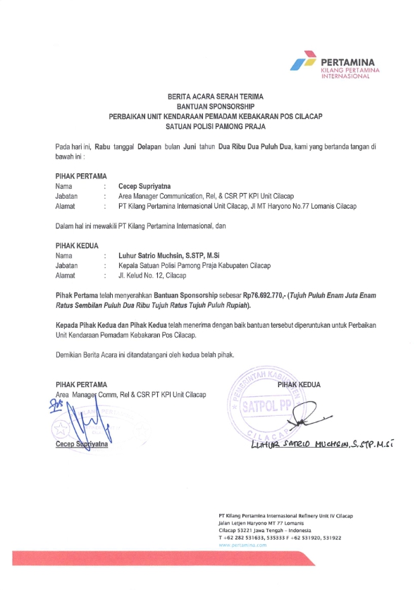 Bantuan TJSL perbaikan unit kendaraan pemadam kebakaran unit pos Cilacap senilai Rp 76.692.770,- diberikan kepada Satuan Polisi Pamong Praja Cilacap