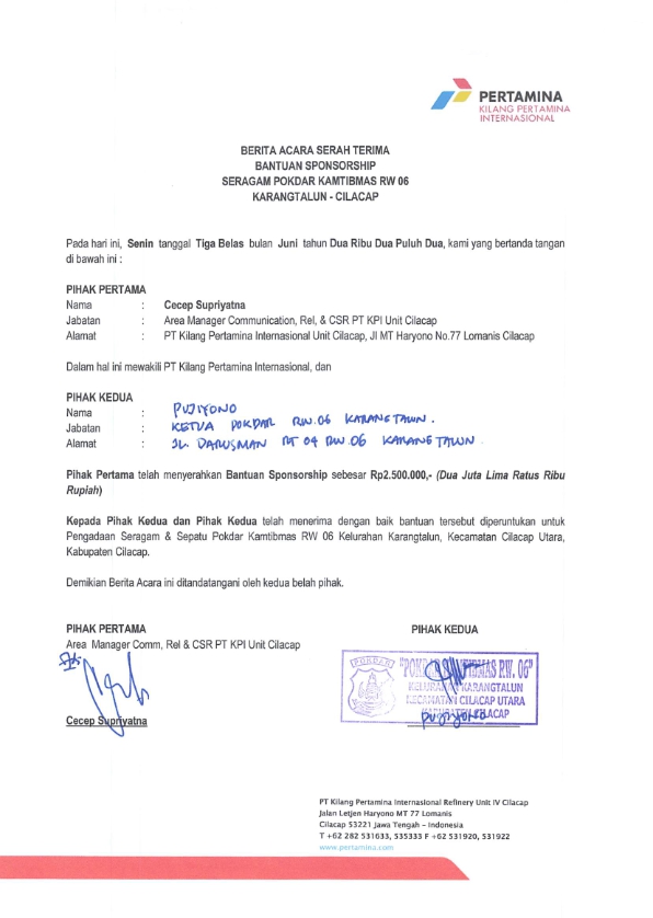 Bantuan TJSL berupa dana sebesar Rp 2.500.000,- diberikan kepada Pokdar Kamtibmas RW 06, Karangtalun untuk pengadaan seragam dan sepatu anggota pokdar