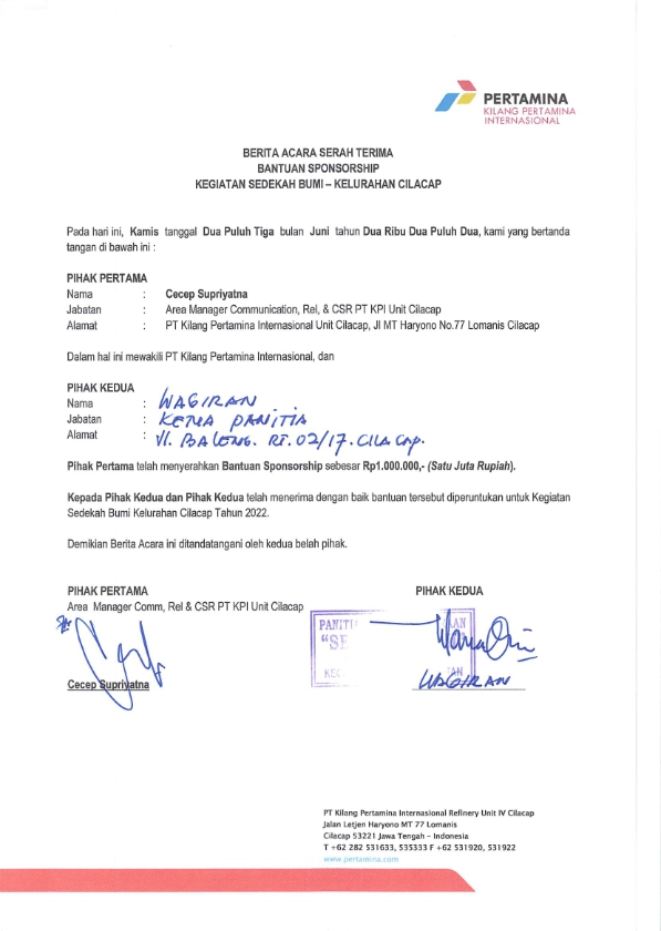 Bantuan TJSL berupa dana sebesar Rp 1.000.000,- diberikan kepada Kelurahan Cilacap untuk pelaksanaan Budaya Sedekah Bumi