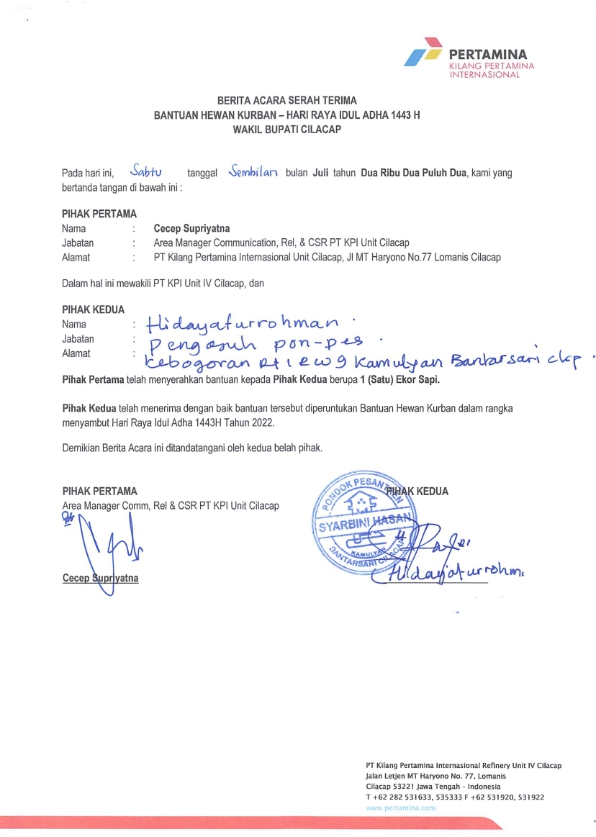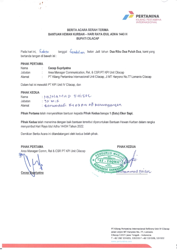 | Keterangan | : | Bantuan TJSL berupa hewan Kurban Dalam Rangka Hari Raya Idul Adha 1443H Tahun 2022 untuk Pengurus masjid Al- Taqwa Kawunganten ( 1 ekor sapi ) dan Pondok pesantren Syarbini Hasan Bantarsari ( 1 ekor sapi ). |