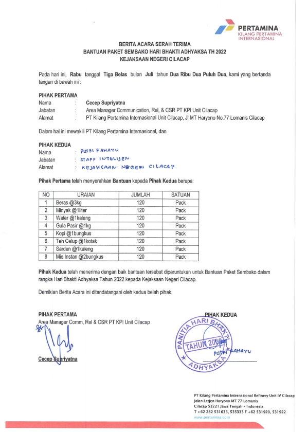 | Keterangan | : | Bantuan TJSL berupa 120 Paket Sembako untuk Kejaksaan Negeri Cilacap dalam rangka Hari Bhakti Adhyaksa ke-62 |