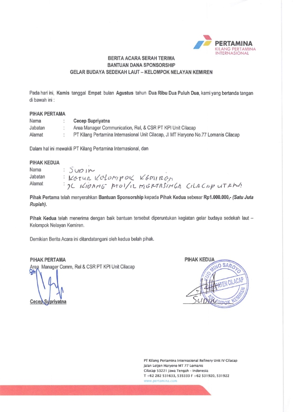 Bantuan TJSL berupa dana sebesar Rp 1.000.000,- diberikan kepada kelompok nelayan Kemiren untuk menyelenggarakan Gelar Budaya Sedekah Laut tahun 2022