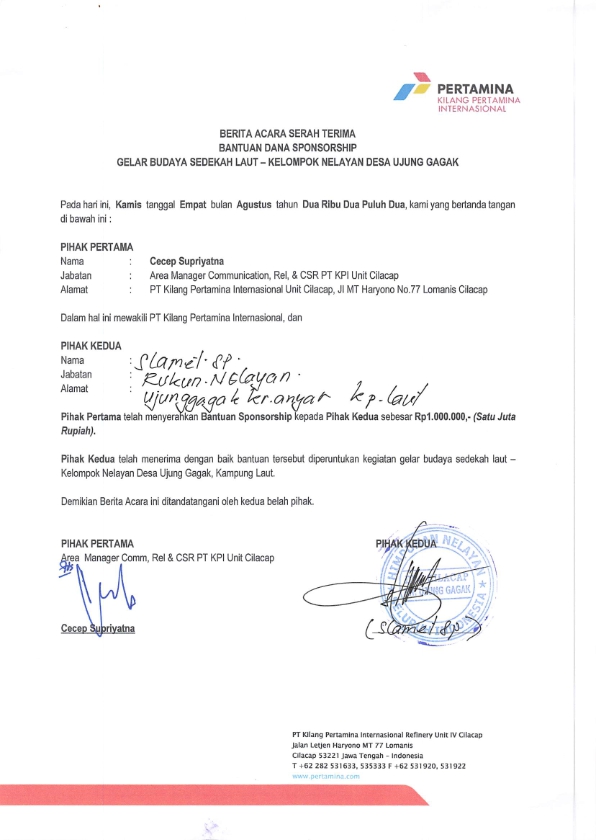 Bantuan TJSL berupa dana sebesar Rp 1.000.000,- diberikan kepada kelompok nelayan Kampung Laut Desa Ujunggagak untuk menyelenggarakan Gelar Budaya Sedekah Laut tahun 2022