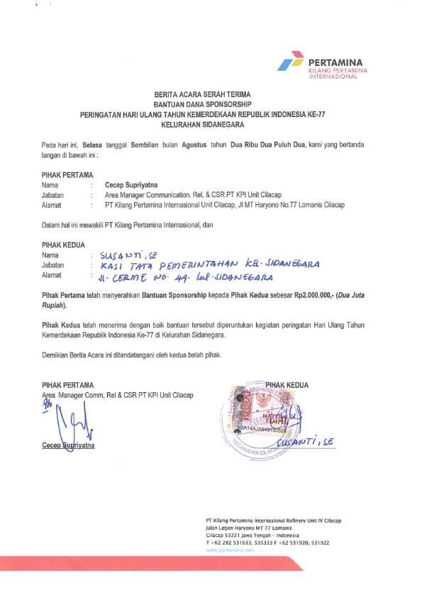 | Keterangan | : | Bantuan Dana Sponsorship Perayaan HUT RI ke 77 Tahun 2022 di Kelurahan Sidanegara |