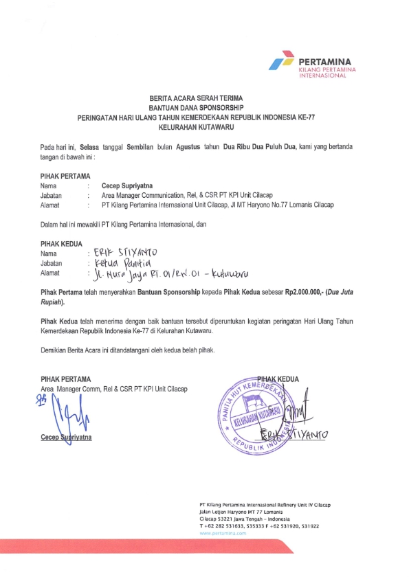 | Keterangan | : | Bantuan Dana Sponsorship Perayaan HUT RI ke 77 Tahun 2022 di Kelurahan Kutawaru |