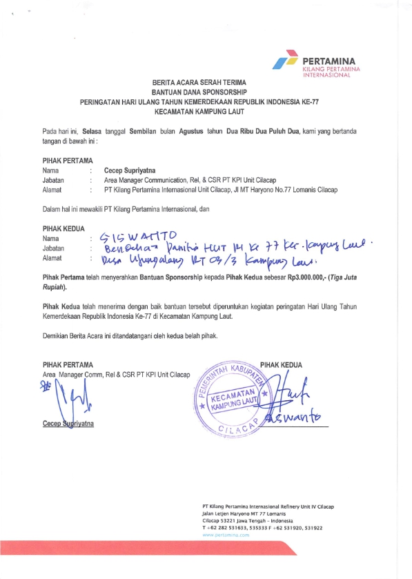 Bantuan Dana Sponsorship diberikan kepada Kantor Kecamatan Kampung Laut untuk merayakan HUT RI ke 77 di Wilayah Kecamatan Kampung Laut