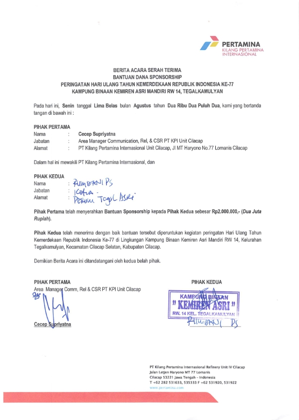 | Keterangan | : | Bantuan Dana Sponsorship Perayaan HUT RI ke 77 Tahun 2022 di RW 14 Kemiren Asri Mandiri Kel. Tegalkamulyan |