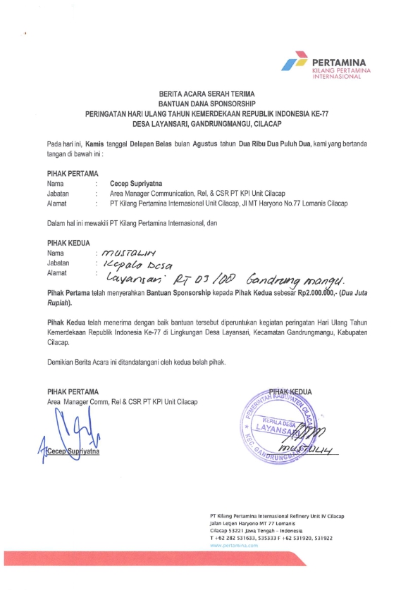 Bantuan Dana Sponsorship diberikan kepada Desa Layansari untuk merayakan HUT RI ke 77 di Wilayah Desa Layansari
