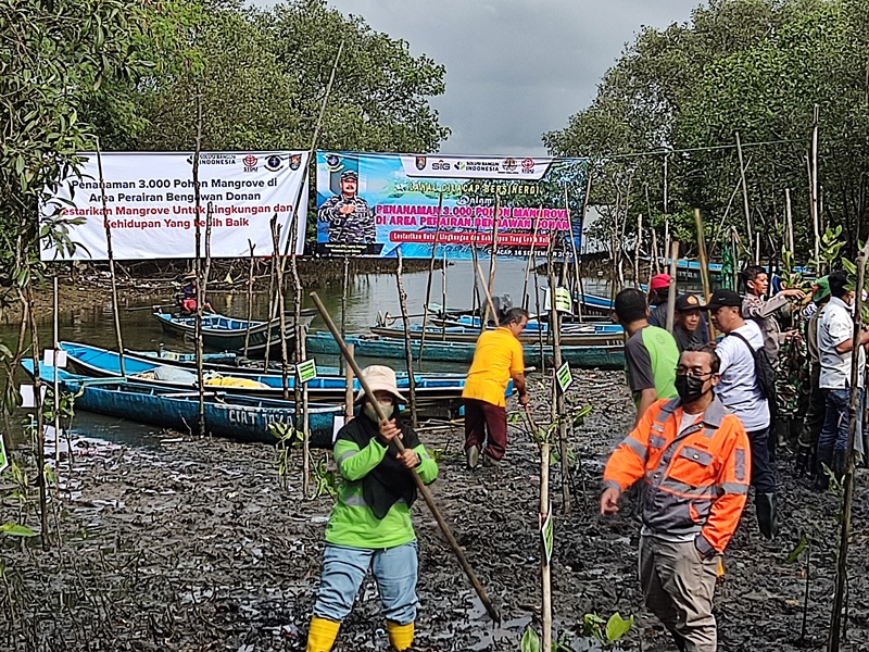 Sosialisasi sistem cluster dan Penanaman 3000 pohon Mangrove di Area Konservasi Mangrove perairan Bengawan Donan RW 05 Karangtalun bersama dengan LANAL, DLH, Stake Holder Sekitar Pabrik dan Tambang, Kelompok budi daya mangrove dan masyarakat menuju rencana eduecowisata mangrove