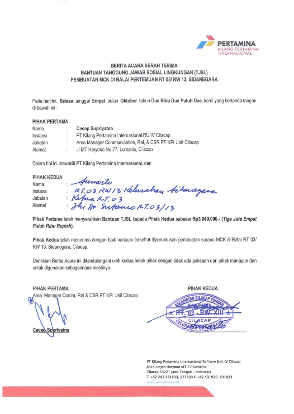 Bantuan Dana TJSL sebesar Rp 3.000.000,- diberikan untuk membangun fasilitas MCK pada Balai Pertemuan RT 03/ RW 13 Kelurahan Sidanegara, Cilacap