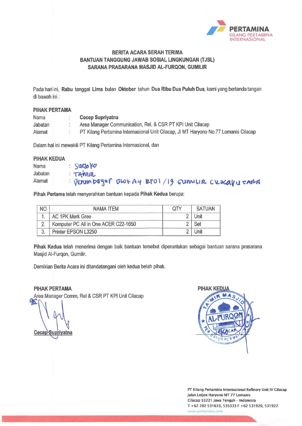 Bantuan TJSL berupa 2 unit Air Conditioner 1PK, 1 unit Komputer dan 1 unit Printer diberikan kepada Masjid Al-Furqon Jl Bayur RW 19 Kel. Gumilir sebagai fasilitas penunjang operasional masjid.