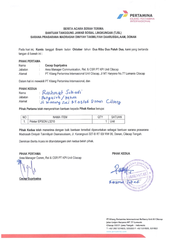 Bantuan TJSL berupa 1 unit Printer diberikan kepada Madrasah Diniyah Takmiliyah Daarussalaam sebagai sarana penunjang operasional madrasah