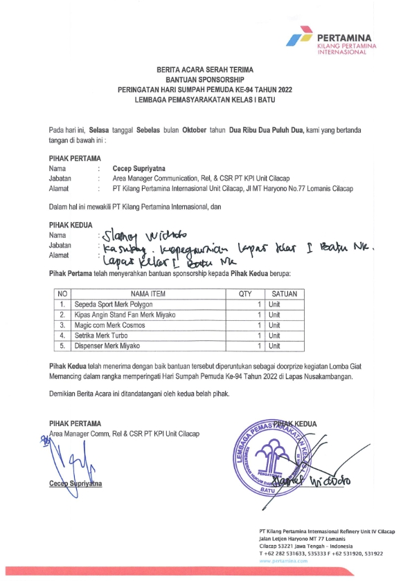 Bantuan Sponsorship berupa doorprize sepeda dan barang elektronik diberikan kepada Lapas Kelas I A Batu Nusakambangan untuk kegiatan peringatan Hari Sumpah Pemuda Tahun 2022