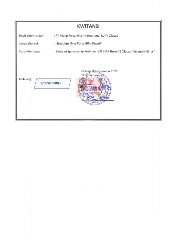 Bantuan Dana Sponsorship sebesar Rp 1.500.000,- diberikan kepada SMA Negeri 2 Cilacap untuk pelaksanaan kegiatan HUT SMA Negeri 2 Cilacap Tahun 2022