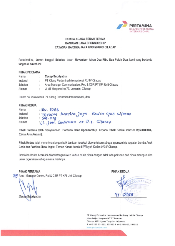 Bantuan Dana Sponsorship sebesar Rp 5.000.000,- diberikan kepada Yayasan Kartika Jaya - Kodim 0703/ Cilacap untuk mendukung pelaksanaan kegiatan Lomba Fashion Show dan Anak Ceria tingkat Taman Kanak-Kanak