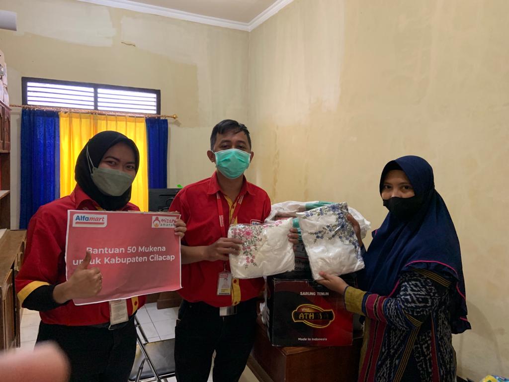 Alfamart menyerahkan bantuan berupa 50 sarung dan 50 mukena