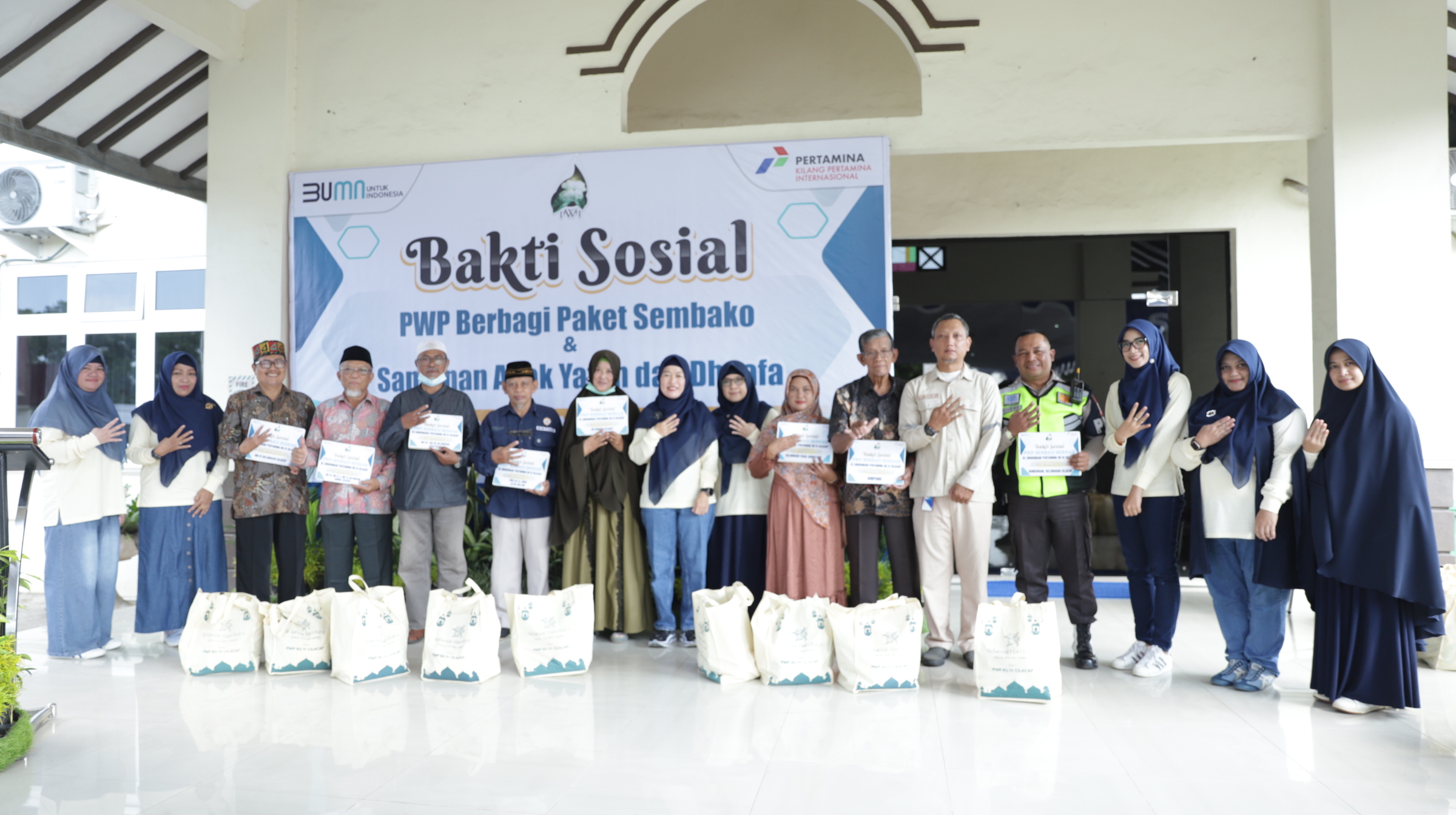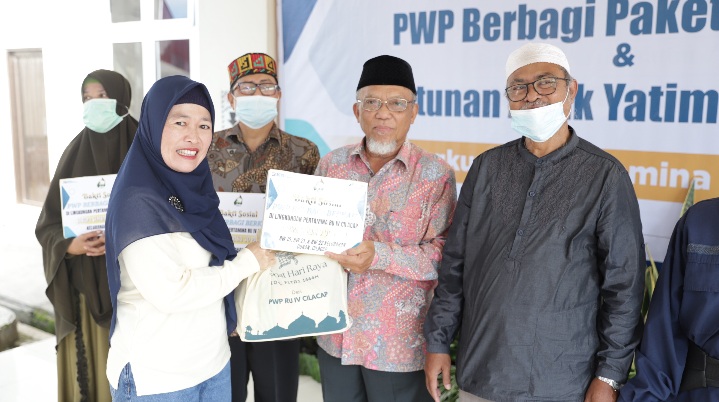 Bantuan bingkisan sembako dibagikan kepada 90 warga di RW 15, 21, 22 Kelurahan Donan dalam acara Bakti Sosial yang diselenggarakan oleh Persatuan Wanita Patra (PWP) Pertamina RU IV Cilacap