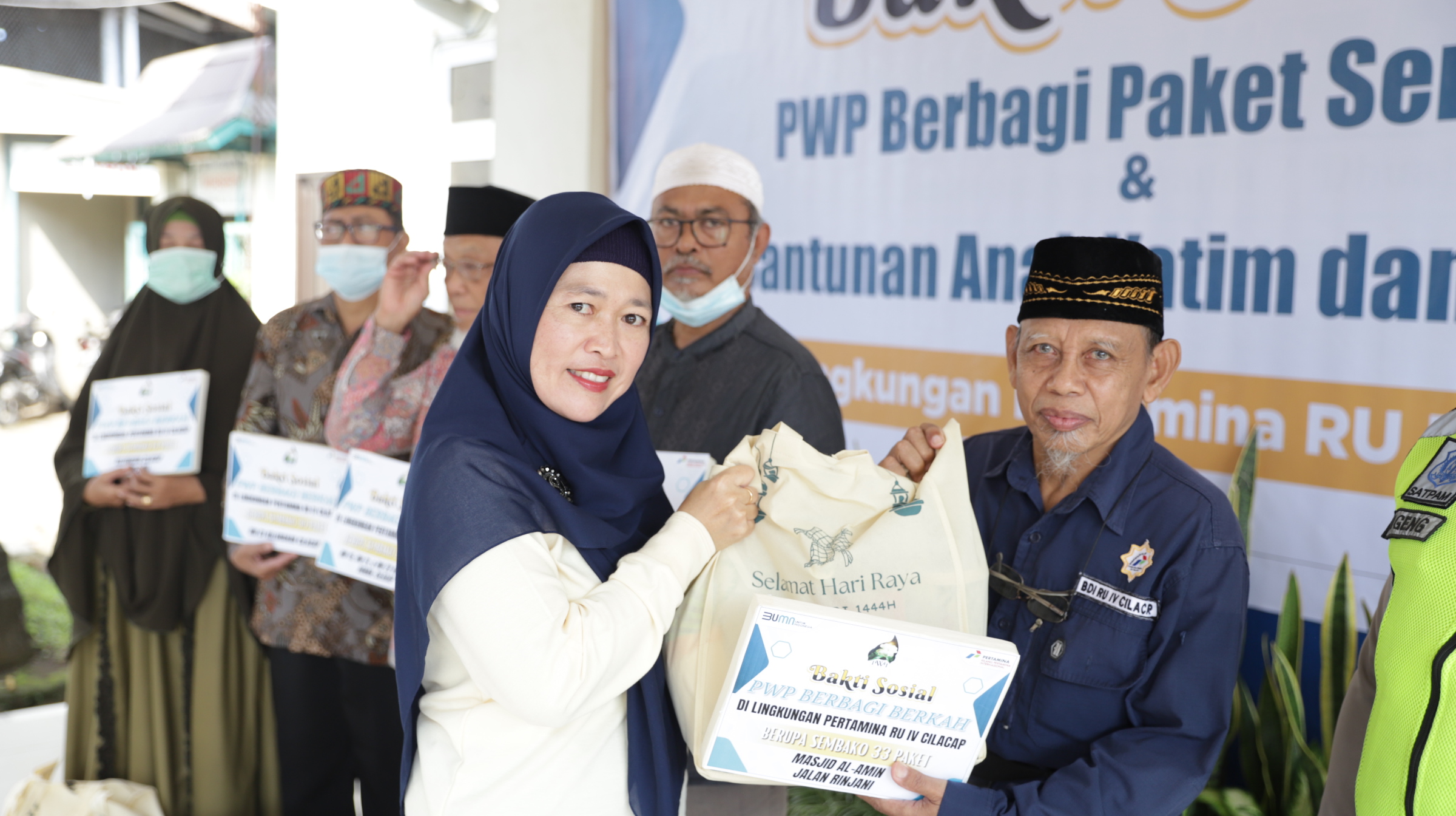 Bantuan bingkisan sembako dibagikan kepada 33 pengurus Masjid Al Amin di Jl. Rinjani Kelurahan Sidanegara dalam acara Bakti Sosial yang diselenggarakan oleh Persatuan Wanita Patra (PWP) Pertamina RU IV Cilacap