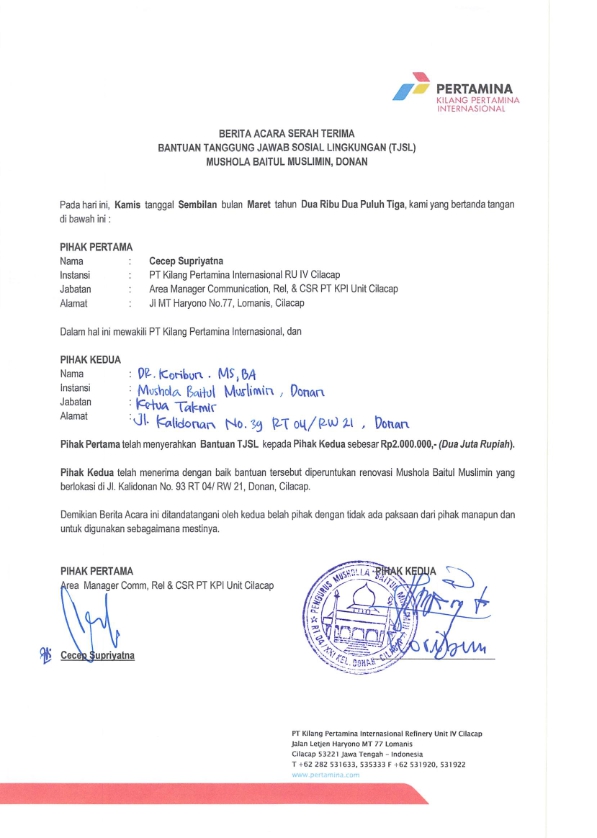 | Keterangan | : | Bantuan TJSL untuk renovasi mushola Baitul Muslimin, Kelurahan Donan |