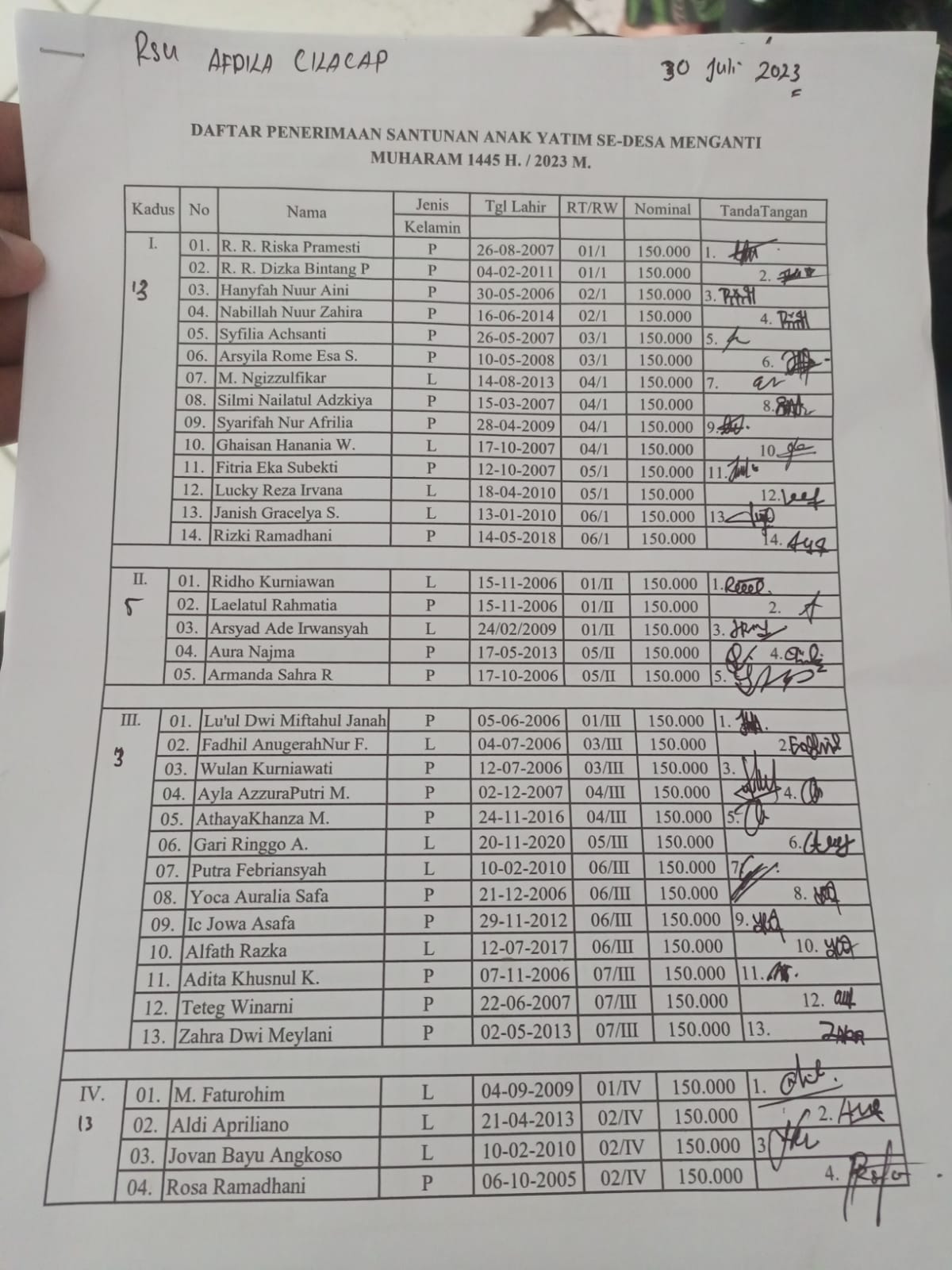 Pemberian santunan kepada anak yatim di lingkungan sekitar RSU Afdila Cilacap sebanyak 109 anak.
