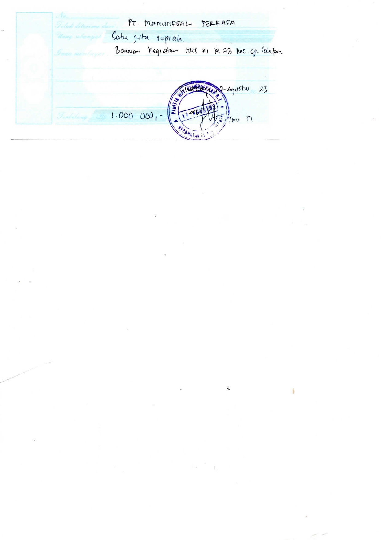 | Keterangan | : | Pemberian bantuan Dana untuk Peringatan HUT Ke-78 Kemerdekaan RI kepada Panitia Peringatan HUT Ke-78 Kemerdekaan RI Kecamatan Cilacap Selatan |