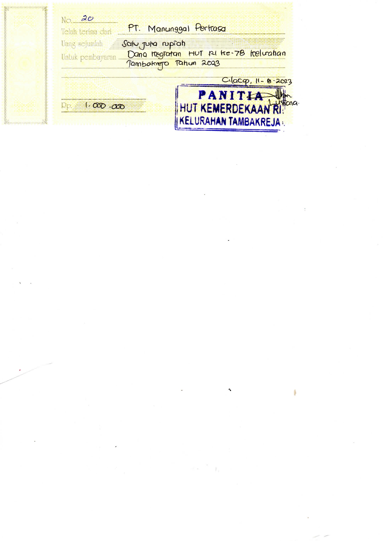 | Keterangan | : | Pemberian Bantuan Dana untuk Peringatan HUT Ke-78 Kemerdekaan Republik Indonesia ke Panitia Peringatan HUT Ke-78 Kemerdekaan RI Kelurahan Tambakreja |