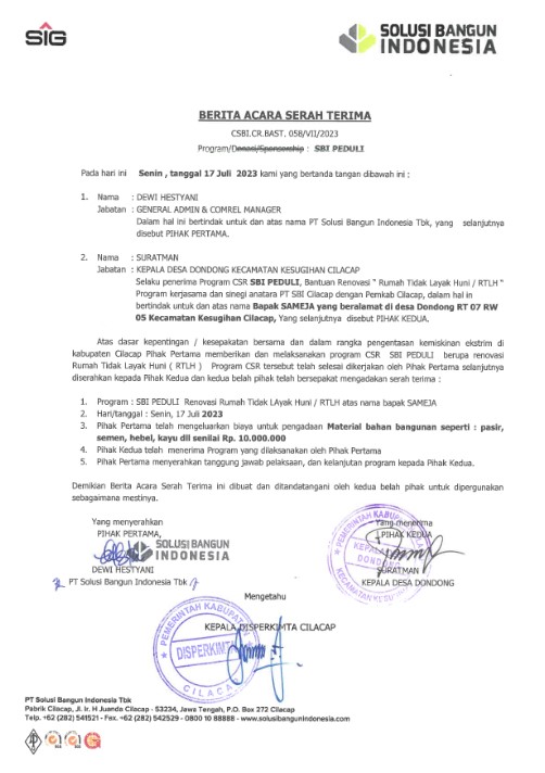 | Keterangan | : | Perbaikan RTLH dilaksanakan berdasarkan kerjasama SBI, Pemda Kab Cilacap dan swadaya masyarakat. Bantuan berupa perbaikan 30 Rumah Tidak Layak Huni (RTLH) di 17 Desa/Kelurahan di Kabupaten Cilacap yaitu pemugaran atau perbaikan rumah. Data penerima perbaikan RTLH berdasarkan data dari Bappeda atau Disperkimta Kabupaten Cilacap dan diverifikasi ulang oleh SBI |