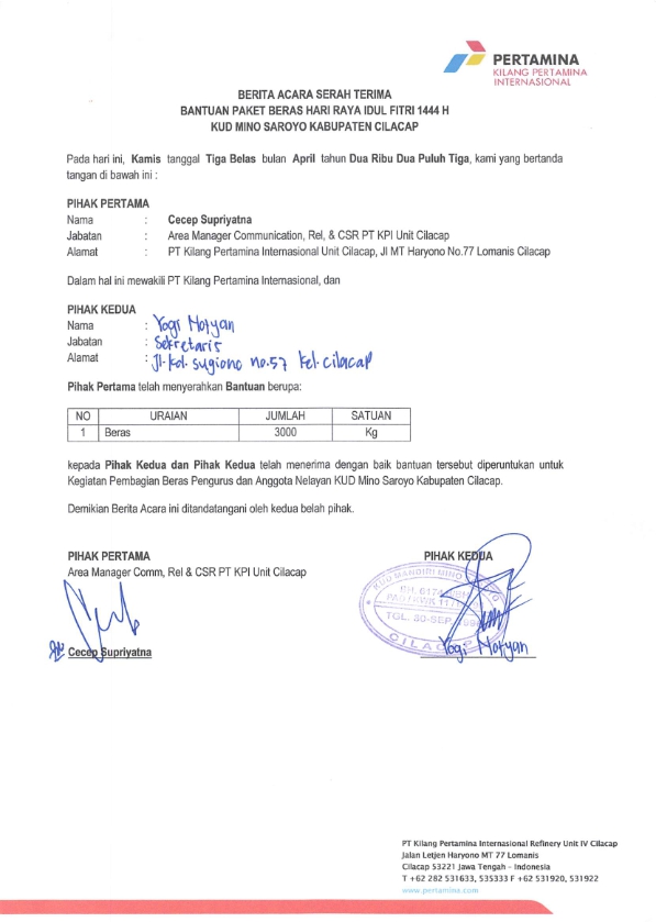 Bantuan3000 Kg beras untuk nelayan melalui KUD Mino Saroyo Kabupaten Cilacap dalam rangka hari raya Idul Fitri 1444 H