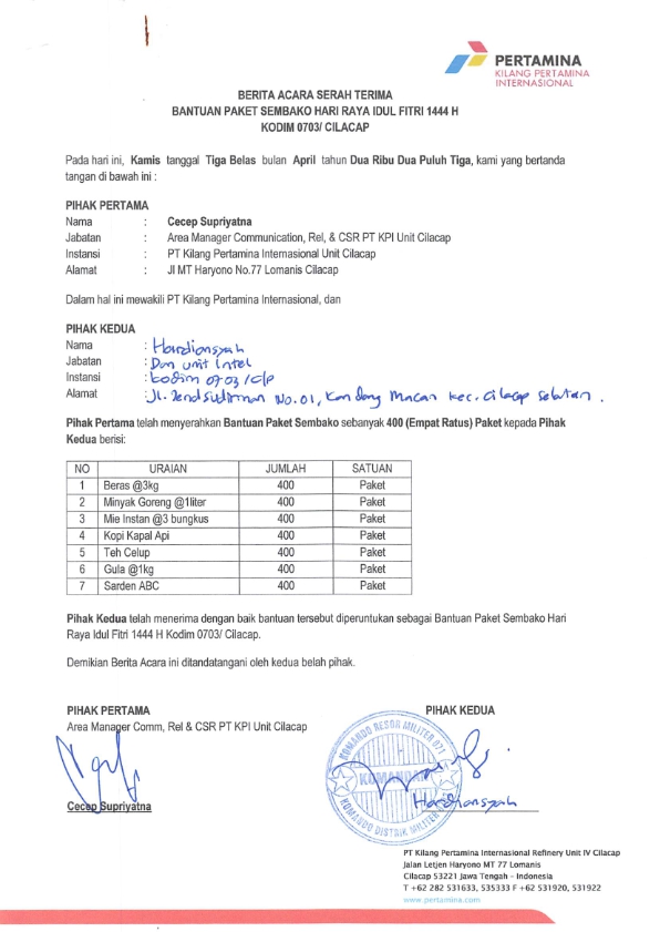 | Keterangan | : | Bantuan Sembako kepada Kodim 0703/ Cilacap |