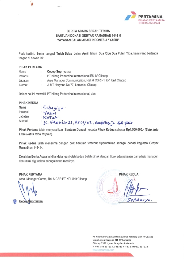 Bantuan dana untuk donasi kegiatan Gebyar Ramadhan 1444 H yang diselenggarakan oleh YASIN Cilacap