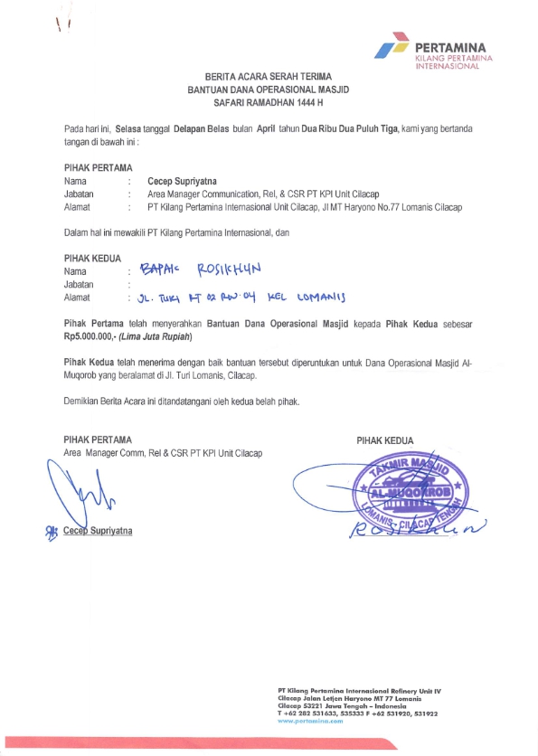 Bantuan dana operasional masjid dalam rangka Safari Ramadhan 1444 H PT Kilang Pertamina Internasional RU IV Cilacap