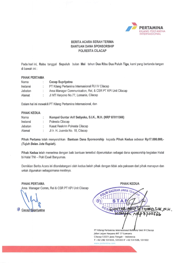 | Keterangan | : | Bantuan dana sponsorship untuk kegiatan Halal Bi Halal TNI - Polri Se Banyumas Raya yang diselenggarakan oleh Polresta Cilacap |