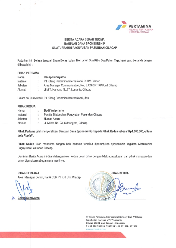 Bantuan dana sponsorship untuk kegiatan silaturahmi Paguyuban Pasundan Cilacap Tahun 2023