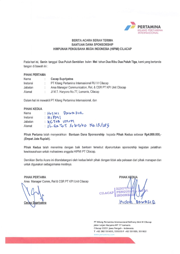 Bantuan dana sponsorship pada kegiatan pelatihan kewirausahaan untuk mahasiswa anggota HIPMI Cilacap