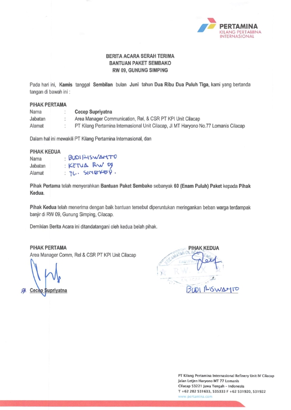 Bantuan paket sembako untuk warga terdampak banjir di wilayah RW 09, Kelurahan Gunung Simping yang merupakan Ring 1 Perum. Pertamina Gunung Simping