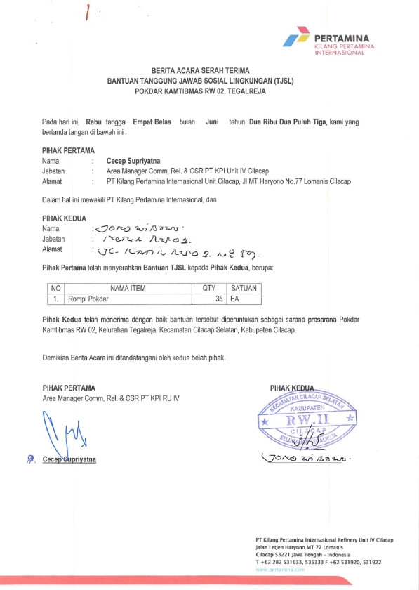 | Objek Realisasi | : | Pokdar Kamtibmas RW 02, Tegalreja |