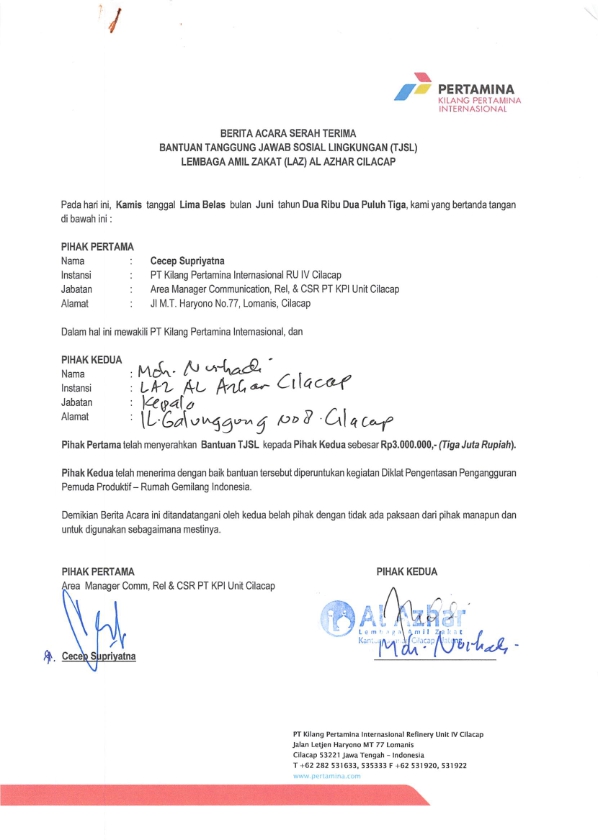 | Keterangan | : | Bantuan dana untuk kegiatan Diklat Pengentasan Pengangguran Pemuda Produktif - Rumah Gemilang Indonesia yang diselenggarakan oleh LAZ Al Azhar Cilacap |