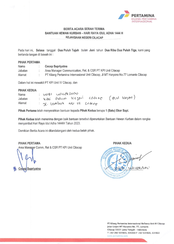 | Keterangan | : | Bantuan Hewan Kurban sebanyak 1 ekor sapi untuk Kejaksaan Negeri Cilacap dalam rangka memperingati Hari Raya Idul Adha 1444 H |