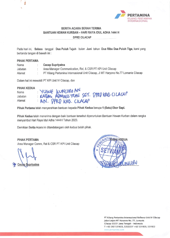 | Keterangan | : | Bantuan Hewan Kurban sebanyak 1 ekor sapi untuk DPRD Cilacap dalam rangka memperingati Hari Raya Idul Adha 1444 H |
