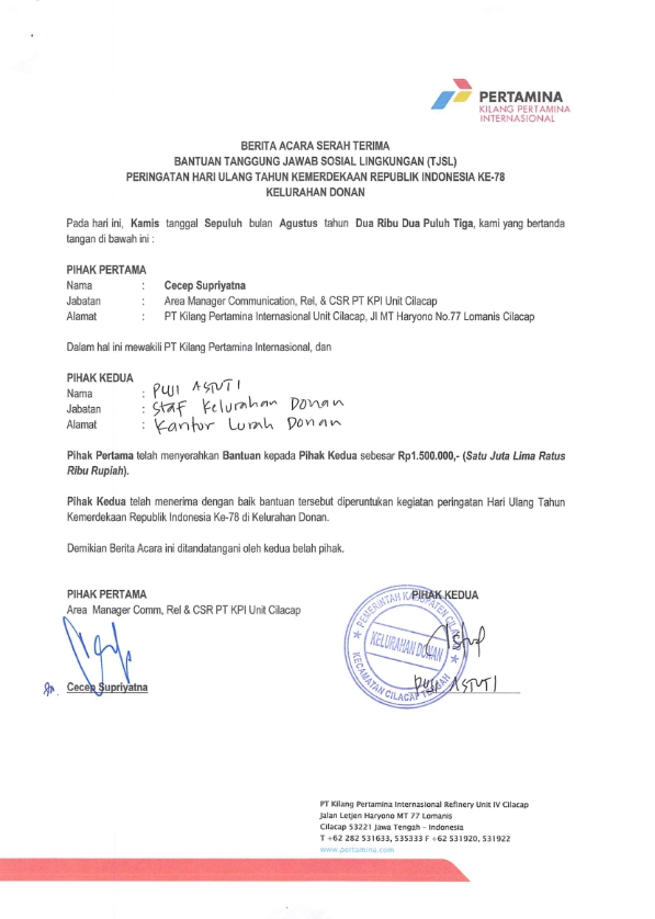 Bantuan dana sponsorship perayaan HUT RI ke-78 Tahun 2023 di Kelurahan Donan