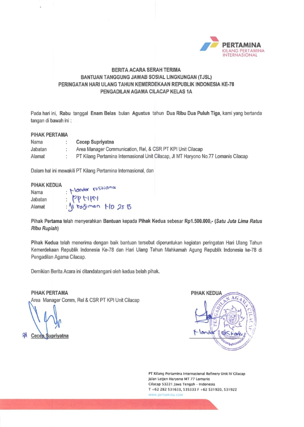Bantuan dana sponsorship perayaan HUT RI ke-78 Tahun 2023 di Pengadilan Agama Cilacap