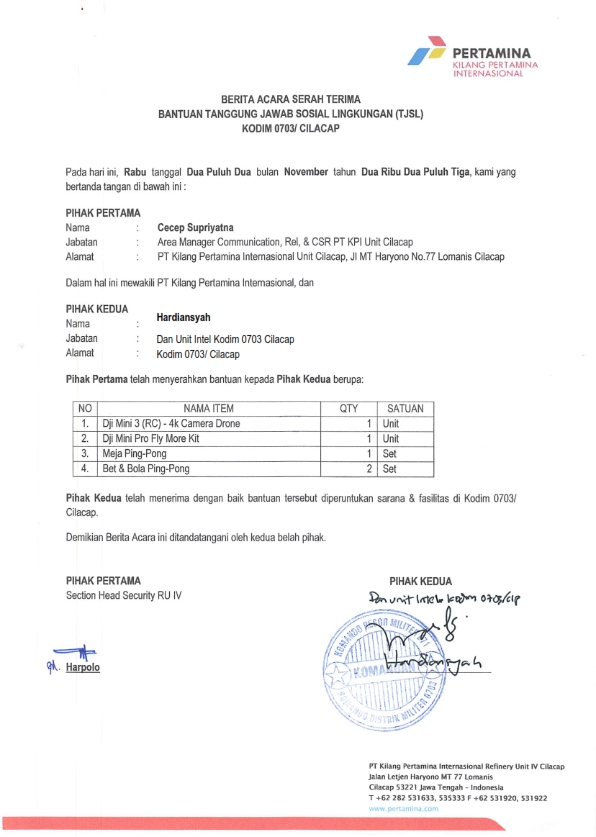 | Keterangan | : | Bantuan meja pingpong dan drone untuk peningkatan fasilitas di kantor Kodim 0703/ Cilacap |