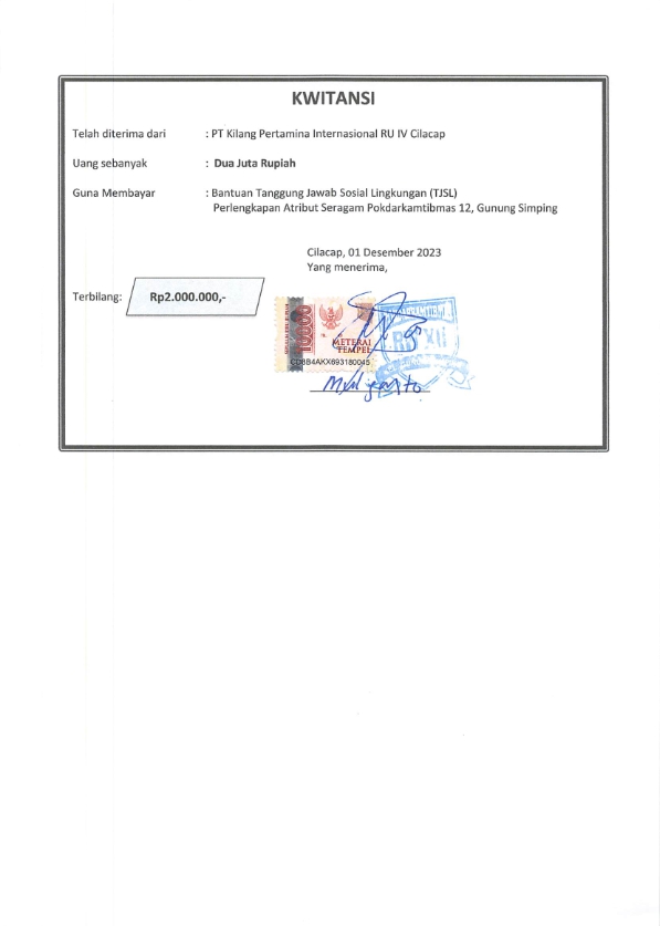 | Objek Realisasi | : | Pokdarkamtibmas RW 12, Gunung Simping Kec. Cilacap Tengah |