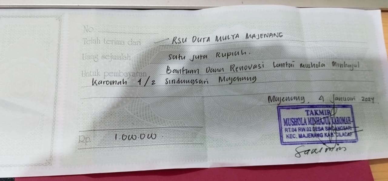 Bantuan dana renovasi lantai Mushola Minhajul Karomah yang terletak di RT 04 RW 02 Desa Sindangsari, Kecamatan Majenang dari RSU Duta Mulya sebesar satu juta rupiah yang sudah diberikan pada hari Kamis, 04 Januari 2024
