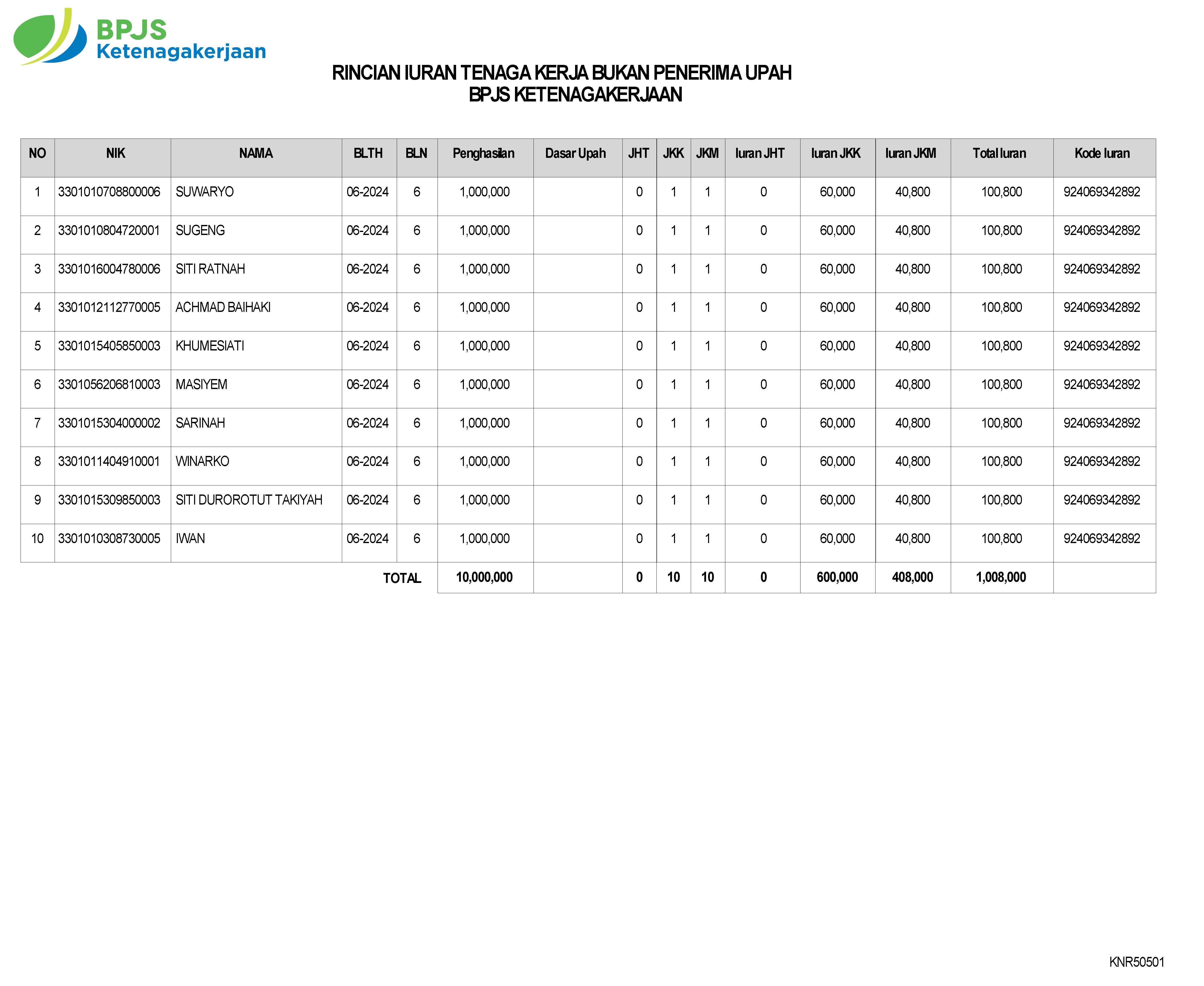 Realisasi bantuan CSR program BPJS Ketenagakerjaan dalam mengcover JKK (Jaminan Kecelakaan Kerja) dan JKM (Jaminan Kematian) untuk peserta Bukan Penerima Upah PT. Toxindo Prima tahun 2024 tahap 1 (Juni - November 2024)